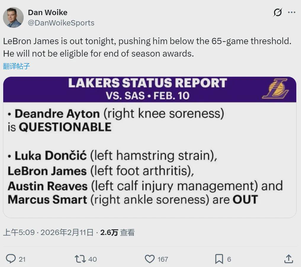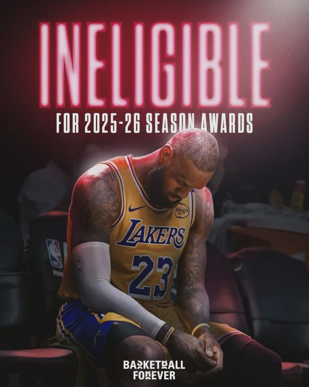 詹姆斯无法出战65场常规赛以上,失去常规赛重要奖项的评选资格。连续21年入选最佳阵容的历史纪录,正式终结了。詹姆斯生涯首次入选最佳阵容是2004-05赛季,当时跟他一起入选二阵的有加内特、韦德、雷阿伦和斯塔德迈尔。